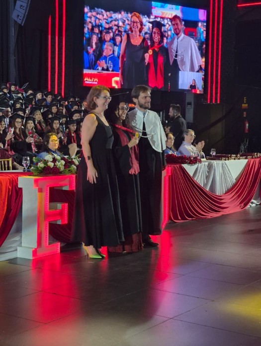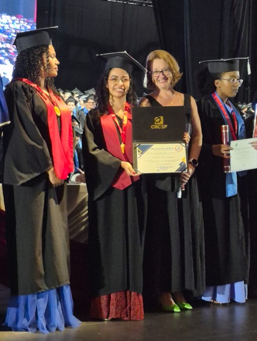 Em uma noite de muita alegria pela conclusão de uma importante etapa na vida acadêmica, os formandos do campus Liberdade das Faculdades Metropolitanas Unidas (FMU) celebraram a colação de grau, em 23 de fevereiro de 2026, em uma solenidade no Expo Barra Funda, na cidade de São Paulo. A conselheira Andreia Tibiriçá e Sá de Jesus representou o CRCSP na cerimônia e prestou uma homenagem da entidade à formanda Beatris Silva Oliveira, indicada pela instituição de ensino para receber o Diploma de Mérito Adauto César de Castro.