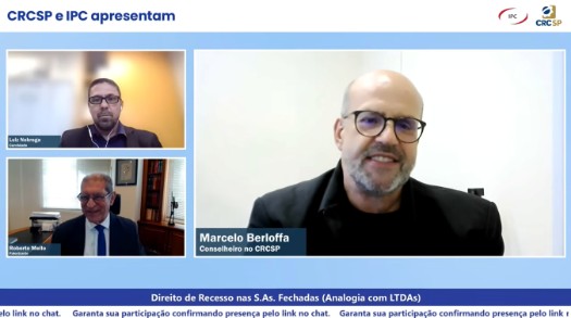 No dia 26, foi a vez dos profissionais que atuam na Contabilidade Societária se atualizarem. A palestra online “Direito de Recesso nas S.A.s Fechadas” foi realizada de forma conjunta pelo CRCSP e pelo IPC e teve como palestrante o especialista Roberto Corrêa de Mello. O presidente do IPC, Luiz Fernando Nóbrega, e o conselheiro Marcelo Viaro Berloffa foram os mediadores da atividade.