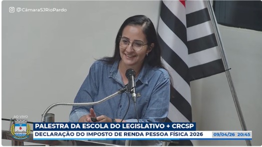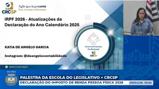 Para esclarecer dúvidas e apresentar as novas regras do Imposto de Renda, o CRCSP e a Escola do Legislativo da Câmara Municipal de São José do Rio Pardo fizeram, no dia 9 de abril, uma palestra gratuita sobre o tema “IRPF 2026 – Atualizações da Declaração do Ano Calendário 2025”. A atividade foi no auditório da Câmara de Vereadores, com transmissão ao vivo no canal da casa legislativa no YouTube.