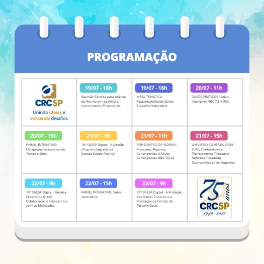 Todas as semanas, o CRCSP promove diversas atividades para que os profissionais da contabilidade estejam sempre atualizados. Confira os próximos temas da programação e inscreva-se no portal do CRCSP.