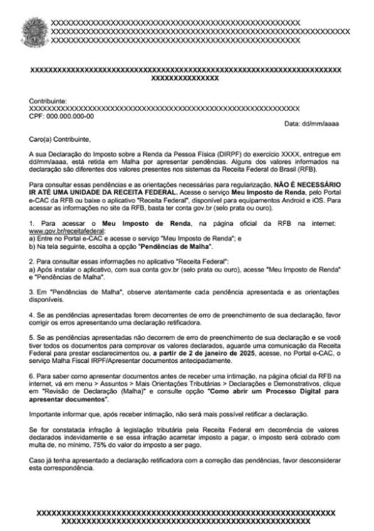 A Receita Federal iniciou, na última terça-feira, 26 de setembro, o envio de 500 mil cartas a contribuintes pessoas físicas de todo o país que estão com a declaração do Imposto de Renda (IRPF2024) retida na malha fina. A intenção é incentivá-los a providenciar sua própria regularização, evitando multas. As cartas serão enviadas em lotes semanais, até o dia 28 de outubro.
